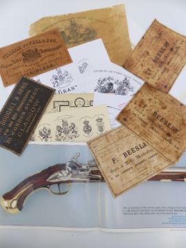 A quantity of reproduction gun labels including G & S Holloway, Charles Lancaster, F Beesley, Samuel & Charles Smith etc
