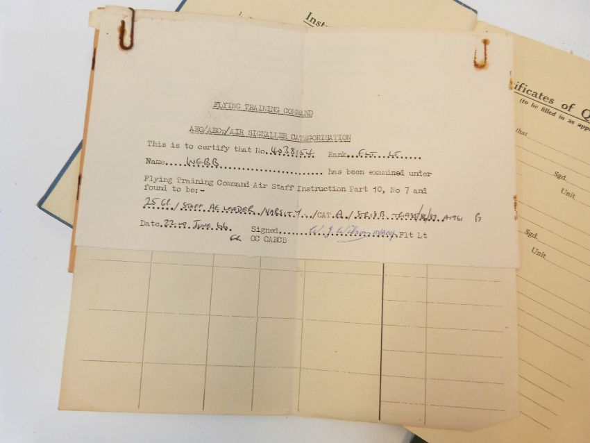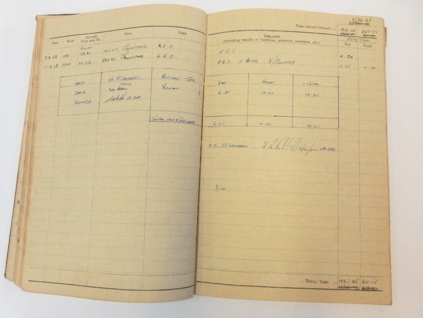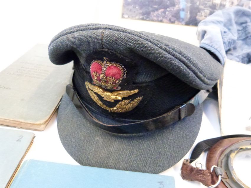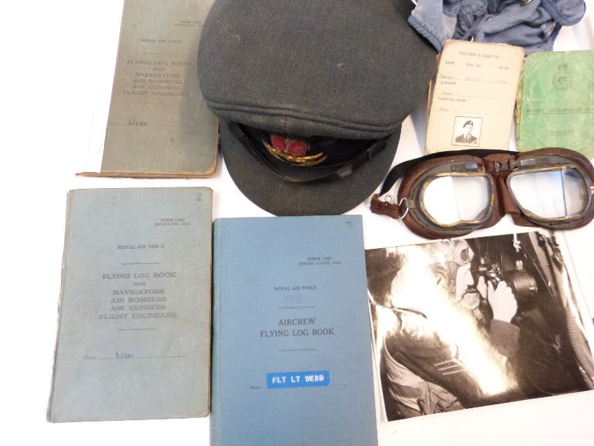 A quantity of items relating to Flight Lieutenant Brian Webb including three logbooks covering late 1949 to 1968 including Anson, Lancaster and Shackleton as signaller, then in 1957 both Canberra and Vulcan as AEO and finally Varsity, totalling over 3500 hours in total, photographs including two showing Webb and other named crew members in front of a V bomber, uniform including blue flying cap dated 1955, goggles etc