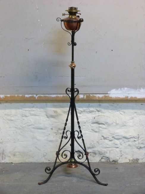 A 19thC Arts and Crafts style Evered & Co copper and brass oil lamp on wrought iron adjustable height base