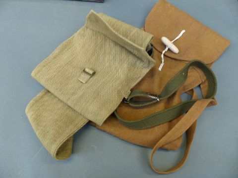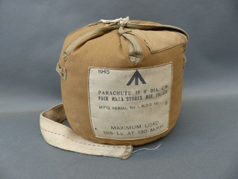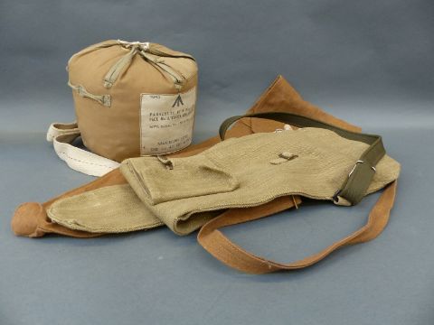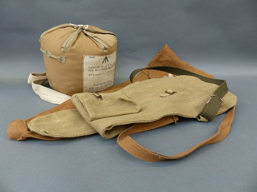 WWII parachute MK I.A 15C/339 in bag, dated 1945, WWII valise, canvas rifle bag and one other example