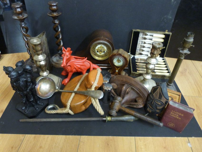A pair of plated candlesticks, oak cased mantel clock, oak rope twist candlesticks, plated cutlery, wall bracket, nauticalia, coal sculpture, inlaid clock, cigarette box etc