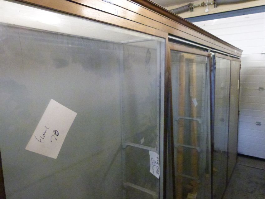 Ex Victoria & Albert Museum early 20thC four door glass display cabinet with bronzed frame. The cornice with impressed letters M1,N1,O1,P1 the cabinet cut in two for transportation. Provision for twelve shelves, some adjustable. Suitable for shop fitting, haberdashery or museum display use. With approximately 10 glass shelves H186 x L370 x D39cmPLEASE SEE IMPORTANT NOTICE ON LOT 1750 BEFORE BIDDING
