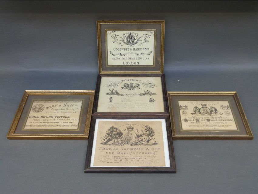 Five vintage gun case labels comprising Army & Navy, Cogswell & Harrison, Forsyth & Co, Thomas Jackson & Son and Watson Bros, all framed and glazed