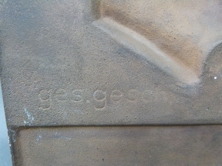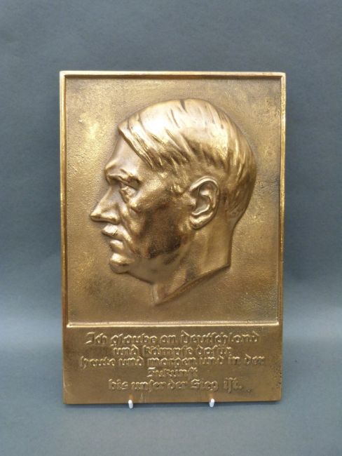 A German brass or bronze plaque of Adolf Hitler with motto below, 32 x 21cm