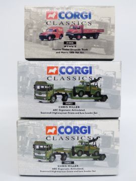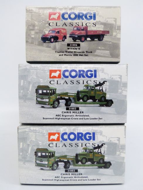 Three Corgi Classics Heavy Haulage 1:50 scale diecast model vehicles sets, two Chris Miller AEC Ergonomic Articulated Scammell Highwayman Crane and Low Loader sets 31003 and Wynns Thames Trader Dropside Truck and Morris 1000 van set 31006, all in original boxes