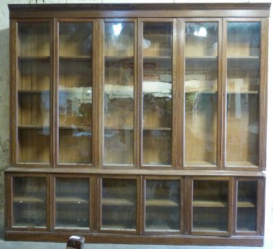 A large glazed oak bookcase, the top three sections each with double doors and adjustable shelves, the base also fitted with glazed cupboards, W263, D45, H243cm