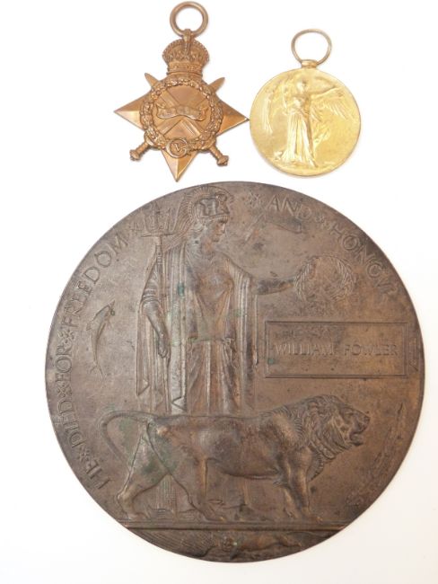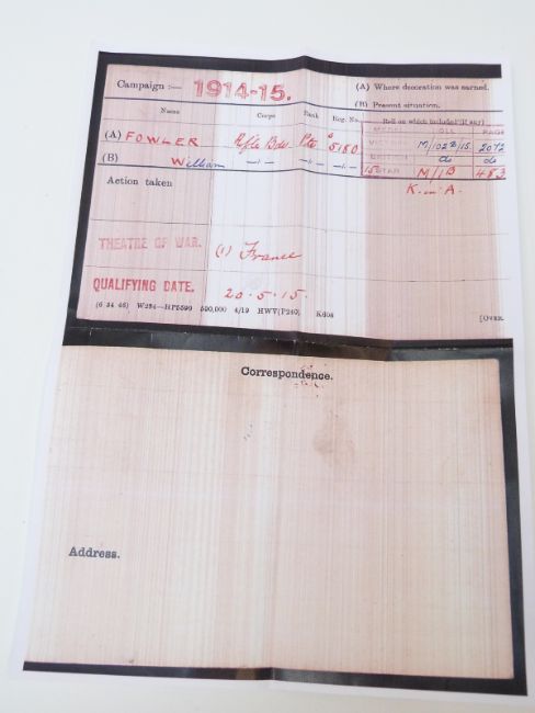WWI medal pair comprising 1914-1915 Star and Victory Medal awarded to S-5180 Pte W Fowler Rifle Brigade together with death plaque. William Fowler resided in Kensington Middlesex and died in France on 30th July 1915 after being on the Western Front for less than four months