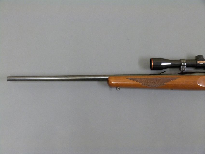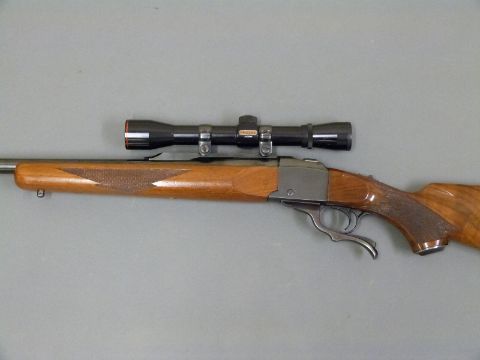 Ruger No.1 .243 (WIN.) falling block sporting rifle with underlever action, chequered semi-pistol grip and forend, sling mounts, adjustable trigger, Simmons 4x32 scope and 26 inch barrel, overall length 117.5cm, serial number 131-34808, in lockable hard carry case with key. PLEASE NOTE THAT A VALID RELEVANT FIREARMS/SHOTGUN CERTIFICATE IS REQUIRED TO HANDLE/PURCHASE THIS ITEM.