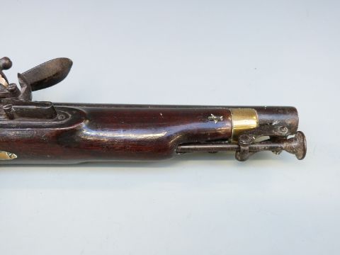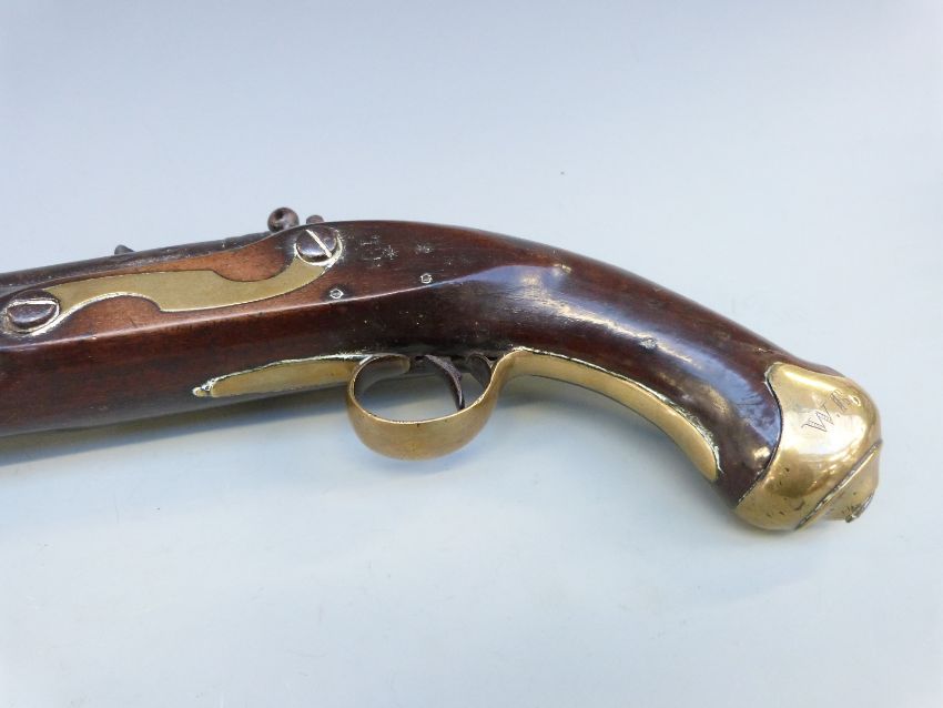 New Land Pattern flintlock hammer action pistol with Tower and GR cypher to the lock, brass trigger guard and mounts, captive ram-rod, engraved 'No 27 W.R, W.S.Rt' issue marks, 'BO' under ministry arrow stamped to grip, 'TR' under star and crown to the left side, and 8.5 inch barrel, overall length 40cm.