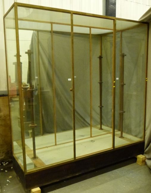 Ex Victoria & Albert Museum early 20thC glazed display cabinet with bronzed lock fitting impressed Ceilite and mirrored back, raised on an integral wooden plinth. Suitable for shop fitting, haberdashery or museum display use. H2060 x W1980 x D605cmPLEASE SEE IMPORTANT NOTICE ON LOT 1750 BEFORE BIDDING