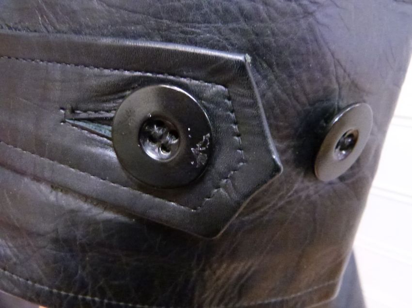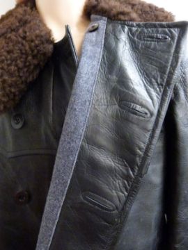 A military pilot's style full length black leather flying coat or jacket with sheepskin collar