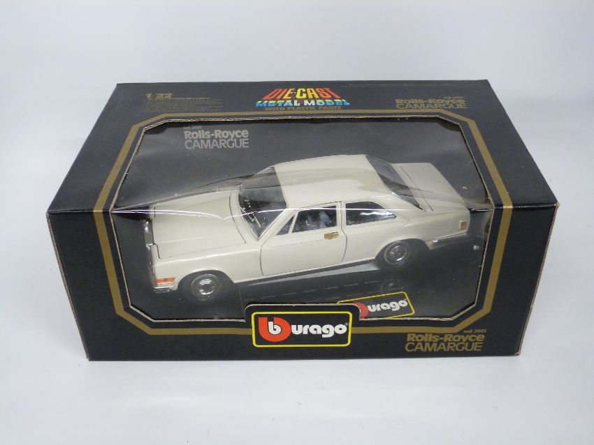 Five Burago and Maisto 1:22 and 1:18 scale diecast model English sports cars comprising Special Edition Jaguar S Type, two Jaguar E Cabriolets, Jaguar SS-100 and Rolls Royce Camargue, all in original boxes
