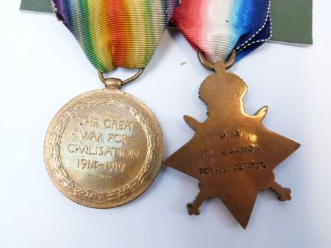 WWI medal pair awarded to 3945 Pte John Judson 1/5th Notts & Derby Regiment (taken prisoner of war 1-7-16) with PoW certificate from the regiment