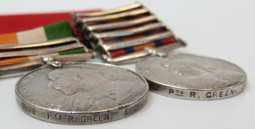 South Africa Medal pair comprising Queens South Africa and King's South Africa medals named to 7670 Pte. R.Green Grenadier Guards the QSA has five clasps; Belfast, Diamond Hill, Johannesburg, Orange Free State and Cape Colony, KSA South Africa with 1901 and 1902 clasp. Robert Green transferred from the Gloucestershire Regiment in October 1898 with copy paperwork of military history and medal roll