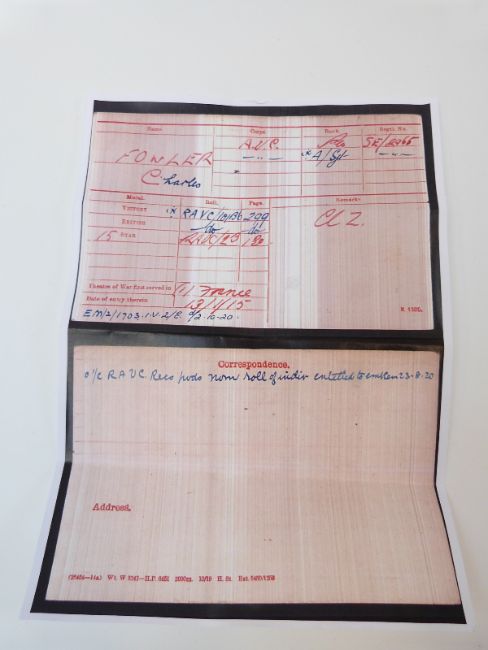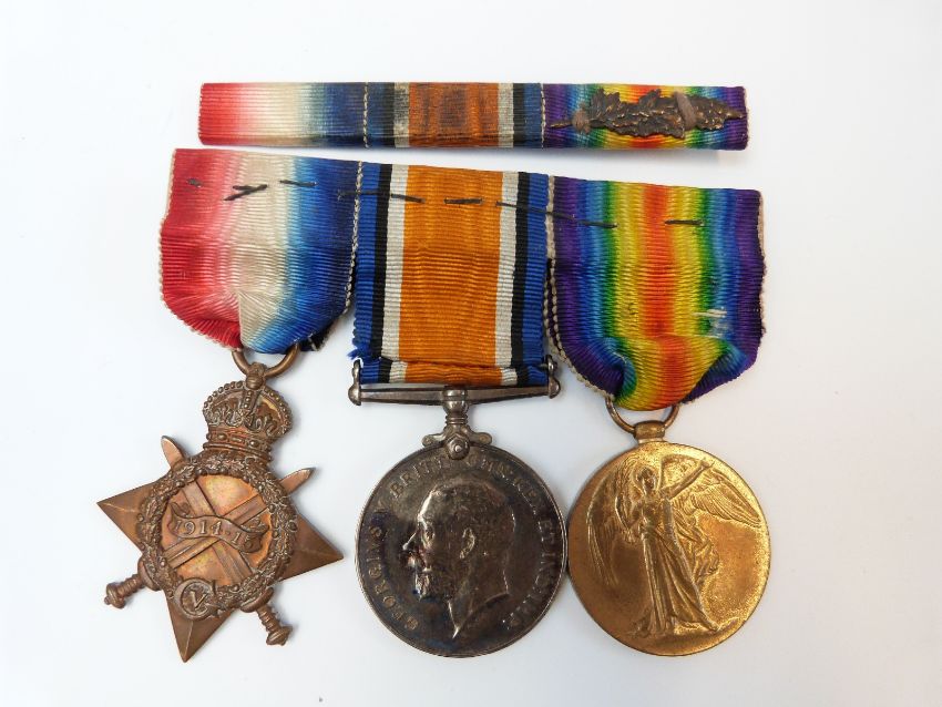 WWI medal trio awarded to SE 2965 A Sjt C Fowler AVC, comprising 1914-1915 Star named to SE 2965 Pte C Fowler AVC and 1914-1918 and Great War medals named to SE2965, A Sjt C Fowler AVC (Army Veterinary Corps), medal bar, dispatches oak leaf and related paperwork