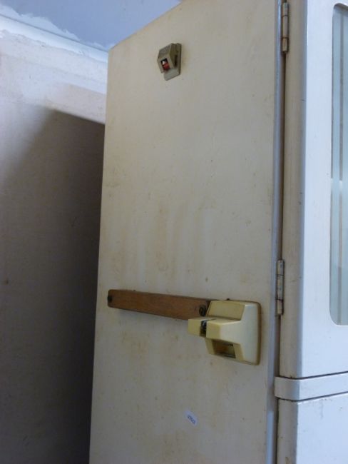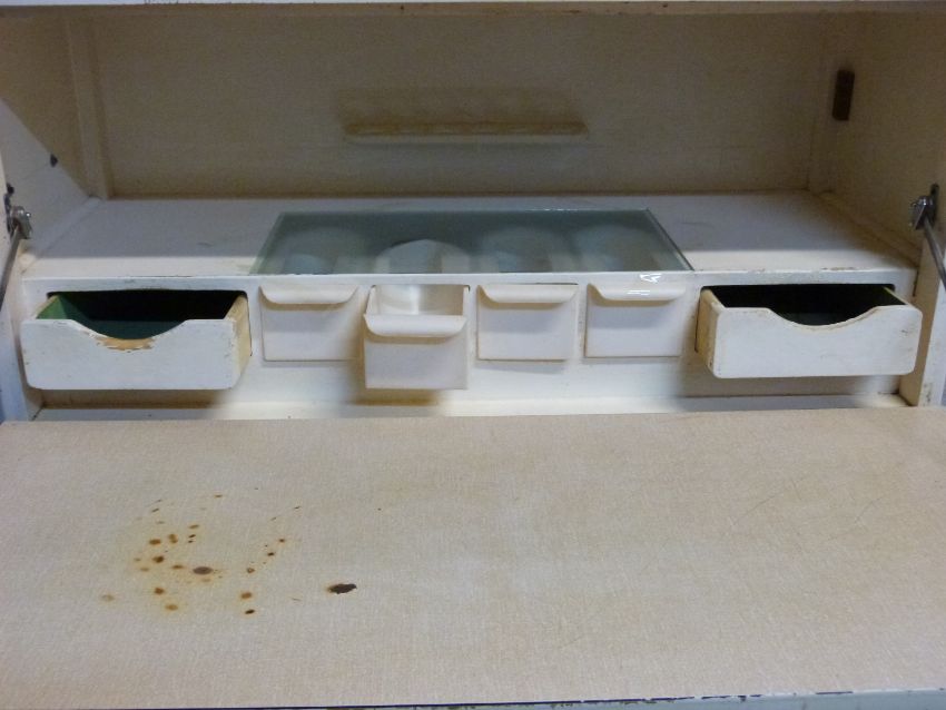 A retro 1950s kitchen cabinet with fold down surface and fitted interior, W91 x D41 x H181