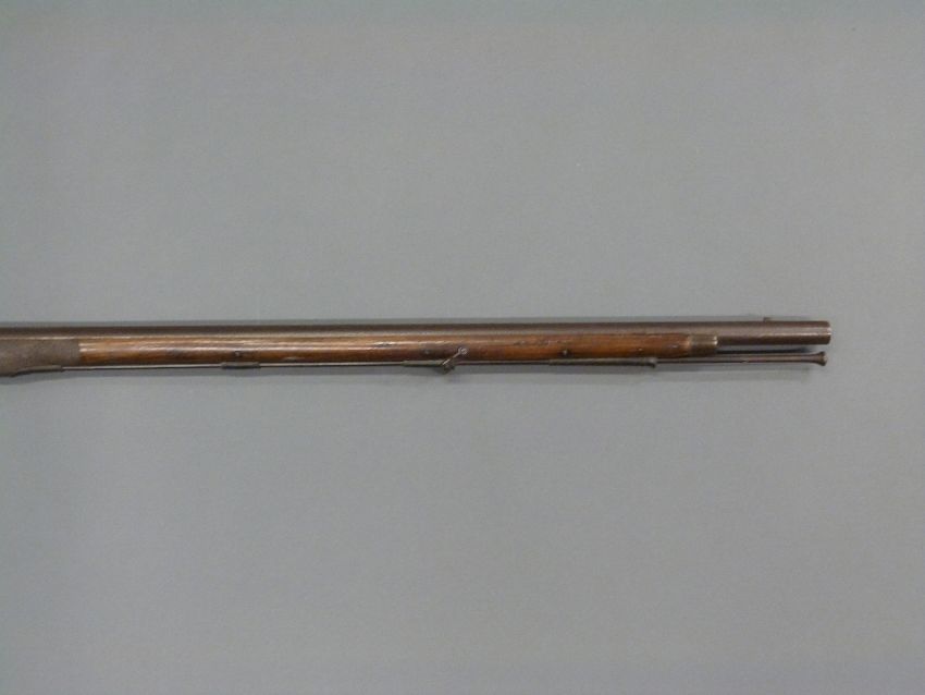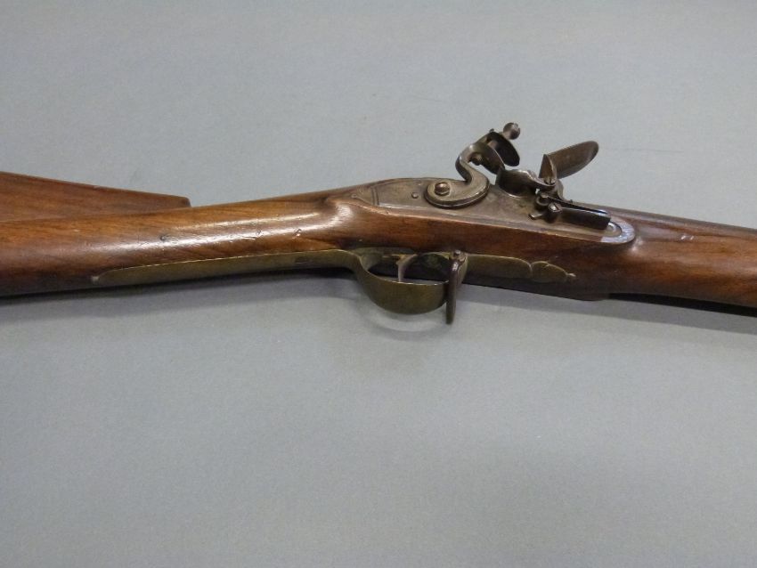 Private purchase or officer's 10 bore flintlock hammer action Brown Bess musket with chequered forend, railed stock, brass butt plate, trigger guard and mounts, vacant wrist cortouche, steel ram-rod, engraved hammer, sling suspension loops and 41 inch barrel, overall length 146cm.