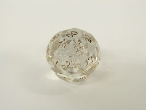 A glass multi-faceted gaming teetotum with individually numbered panels, 2.7cm in diameter.