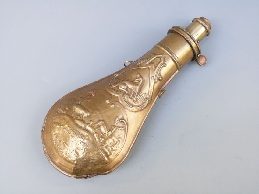 G & J W Hawksley brass powder flask with embossed decoration of stags and dogs to both sides on basket weave background and two suspension loops, 20cm long