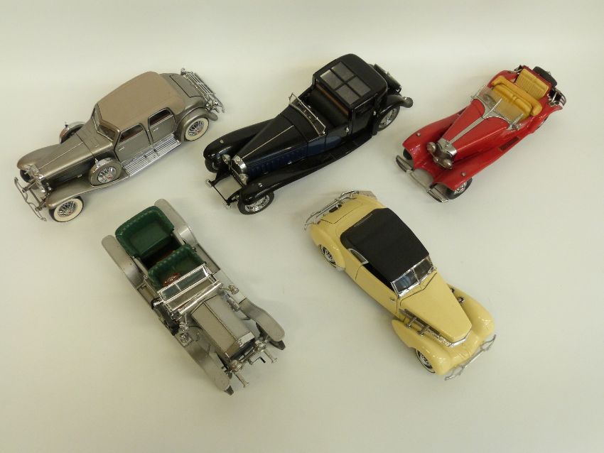 Five Franklin Mint diecast model cars comprising 1935 Mercedes-Benz 500K Special Roadster, 1937 Cord 812 Phaeton Coupe, 1933 Dusenberg SJ Twenty Grand, 1907 Rolls-Royce The Silver Ghost and 1930 Bugatti Royale Coupe Napoleon
