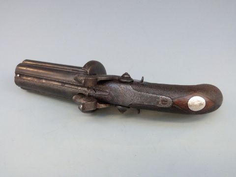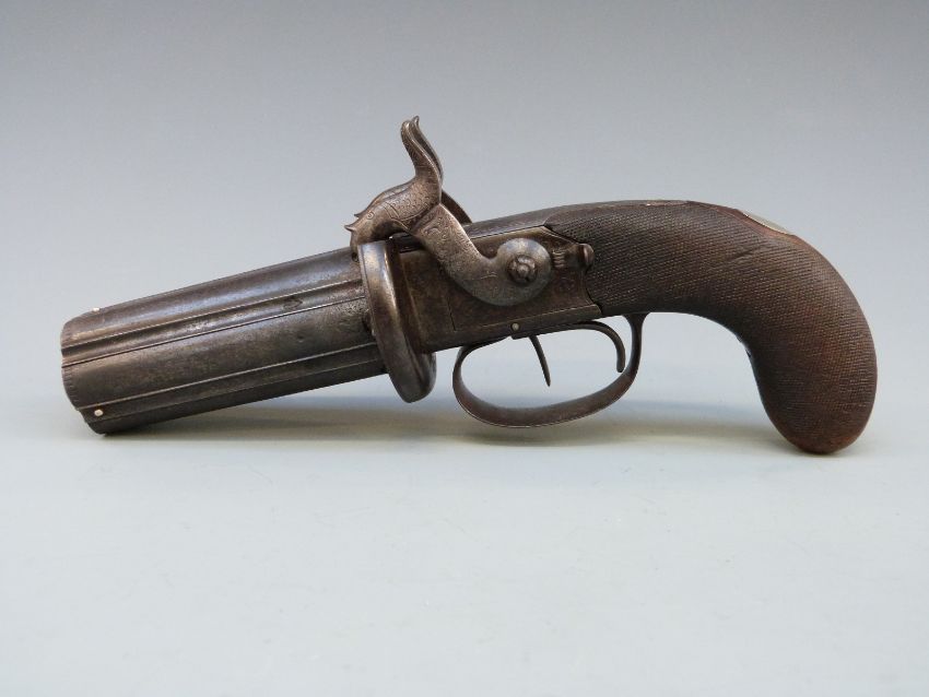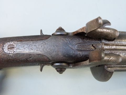 Thomas Blissett of London 88 bore six-shot hand rotated double hammer pepperbox revolver with double trigger, ornately engraved locks, top plate, stylised dolphin hammers and trigger guard, chequered grip, vacant wrist cartouche, top plate marked 'Blissett Leadenhall St London' and 3.5 inch barrels, overall length 23cm, c1825, one of only five known to exist the others baring the names Lang or Purdey.