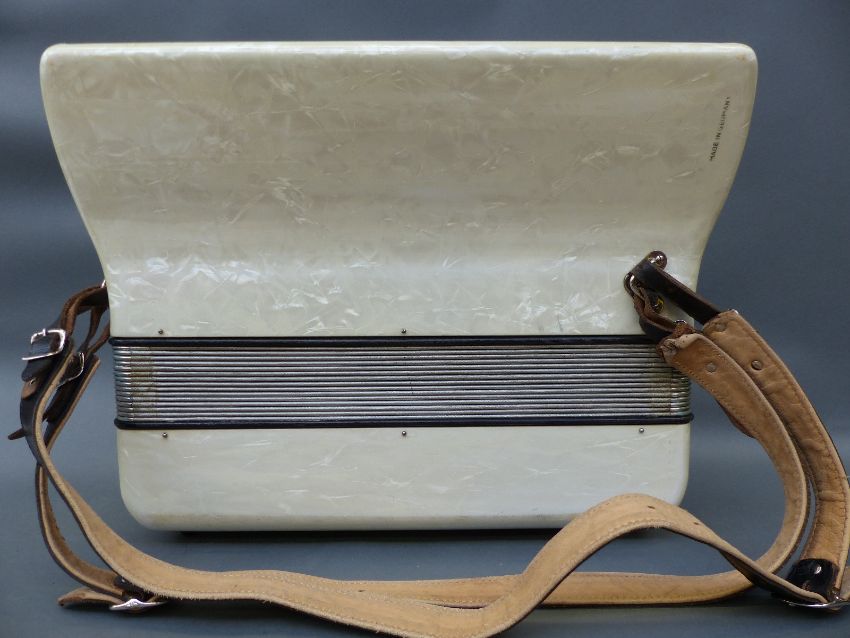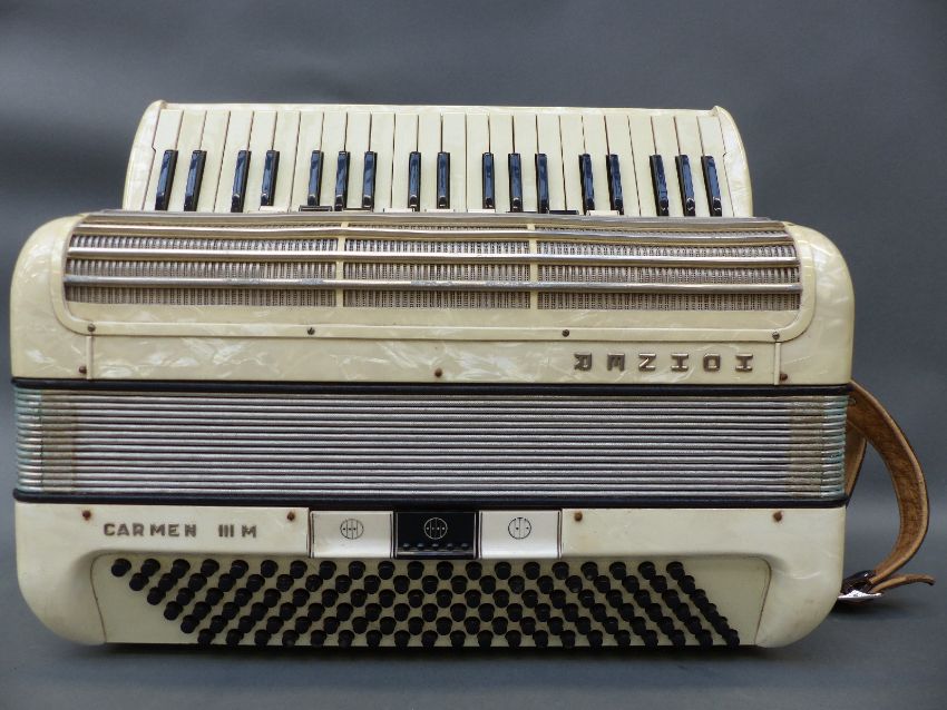 Hohner Carmen III M 120 bass piano accordion with nine treble couplers and three bass couplers, in ivory pearloid finish with case