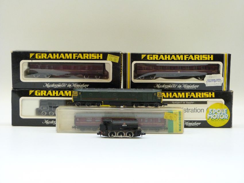 Four Graham Farish N gauge model railway locomotives comprising Standard 4 Tank, two Class 50 Diesels and an Austerity Tank (two in original boxes) together with three various Minitrix and Graham Farish coaches all in original boxes.