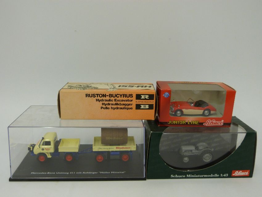 Three Schuco diecast model vehicles comprising Mercedes-Benz Unimog 411 with 'Muller Mitteltal' trailer, Ferguson TE20 tractor and Junior Line Austin Healey Cabrio, all in original boxes