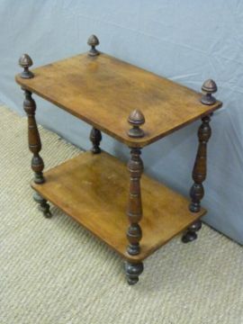 A 19thC two tier whatnot with turned supports raised on ceramic castors, W54 x D34 x H63cm