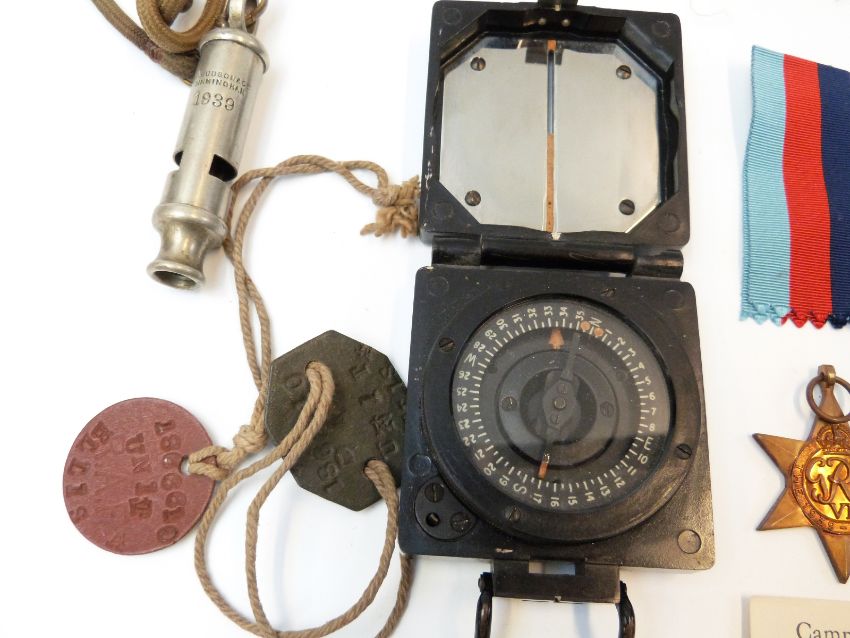 WWII medals awarded to A R Ellis, together with escape map, compass, dog tags etc