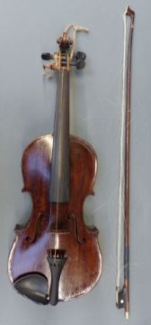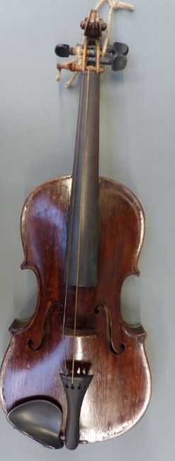A late 19thC / early 20thC cased violin with 33cm two-piece back, complete with bow, Maidstone London to case