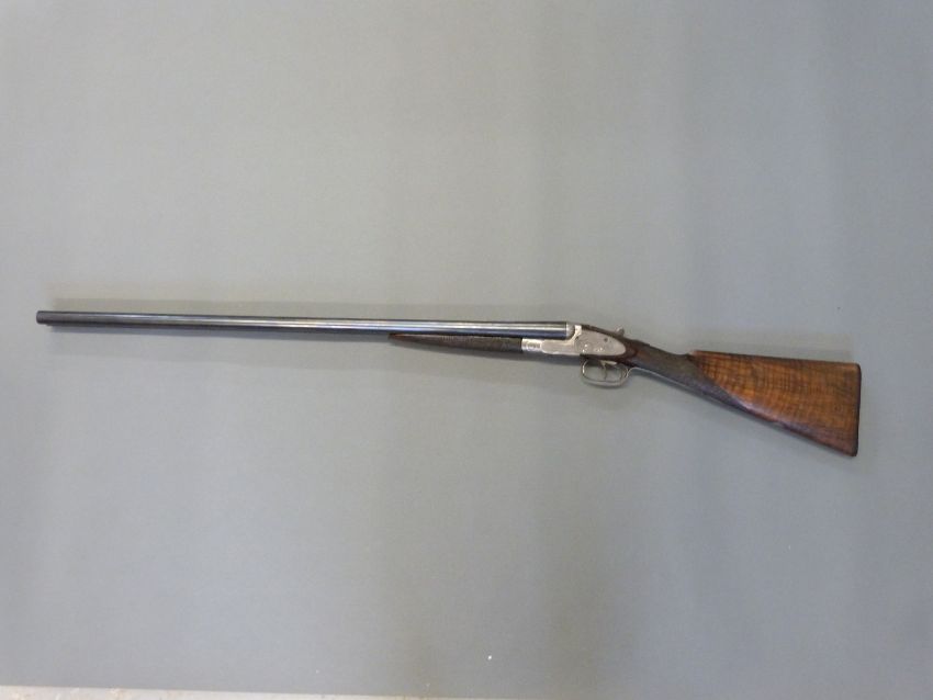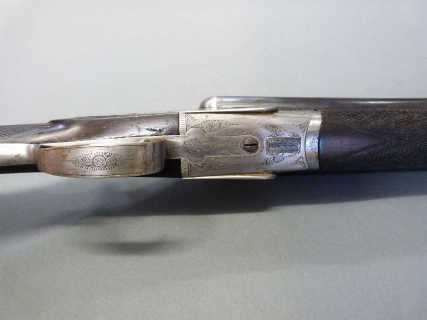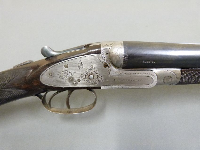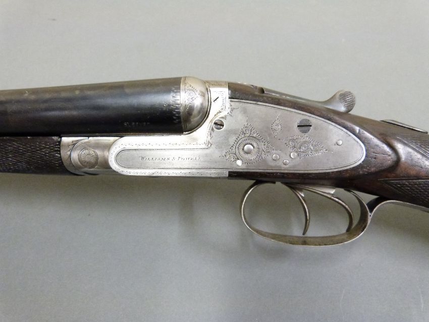 Williams & Powell 12 bore side lock shotgun with named and engraved locks, chequered grip and forend, engraved trigger guard, top plate, top lever, forend and underside, double trigger, vacant cartouche to the underside of the stock and 30 inch barrels choked 3/4 and 1/4, overall length 118cm, length of pull 36cm, serial number 10536, in original canvas and leather case with fitted interior and maker's label. PLEASE NOTE THAT A VALID RELEVANT FIREARMS/SHOTGUN CERTIFICATE IS REQUIRED TO HANDLE/PURCHASE THIS ITEM.