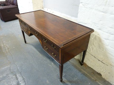 A late 19thC mahogany desk with line inlay decoration, fitted single drawer flanked by two drawers to each side, W151, D63, H74cm