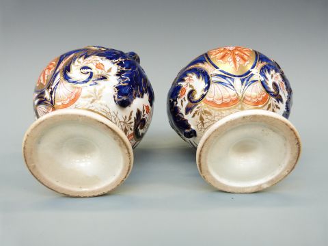 A pair of Regency porcelain inkwells and potpourri, in the form of urns with beast finials, with Imari and gilt decoration, possibly Spode, approximately 12cm tall