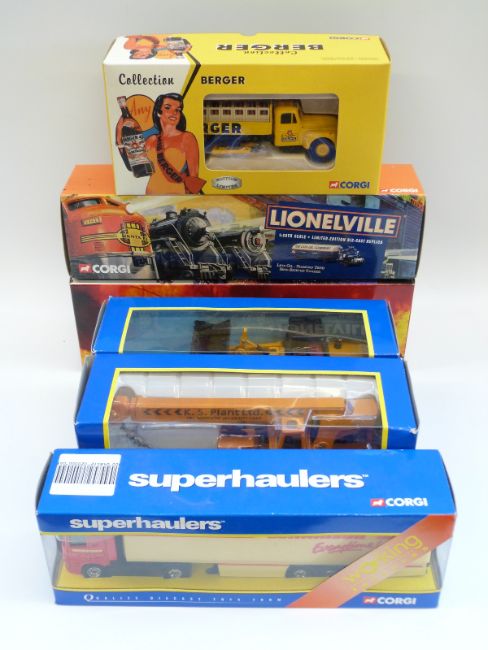Six Corgi diecast model commercial and construction vechicles comprising Heroes Under Fire Washington DC American LaFrance U553506, Lionelville LionOil Diamond T620 Semi-Skirted Tanker U552906, Berger Collection lorry, Superhaulers Wilkinson Scania Container lorry TY86613, KS Plant Hire Mobile Crane 66402 and KS Plant Hire Loader, most limited edition, all in original box