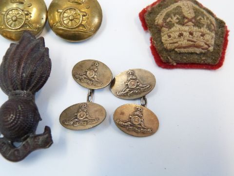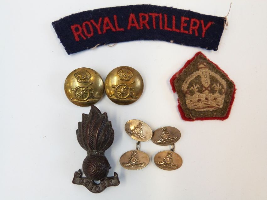 A collection of WWII related Royal Artillery ephemera to include a pair of white metal cufflinks, metal cap badge, buttons, cloth insignia and rank badge
