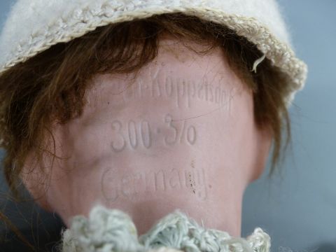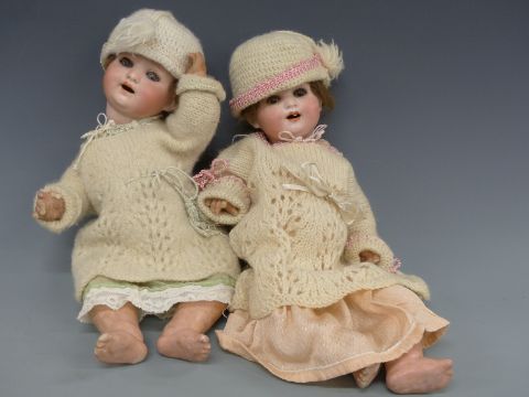 Two Heubach Koppeldorf bisque headed dolls both with open mouths, weighted eyes, brown hair, jointed composite bodies and knitted outfits, 33cm tall