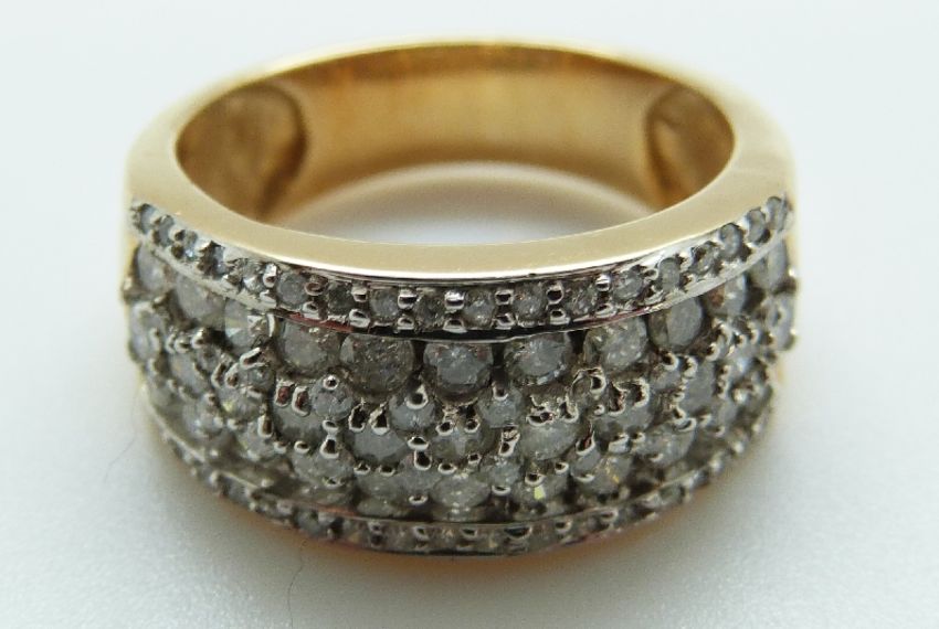 An 18ct gold ring set with diamonds in rows, size P, 8g