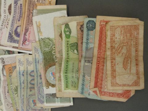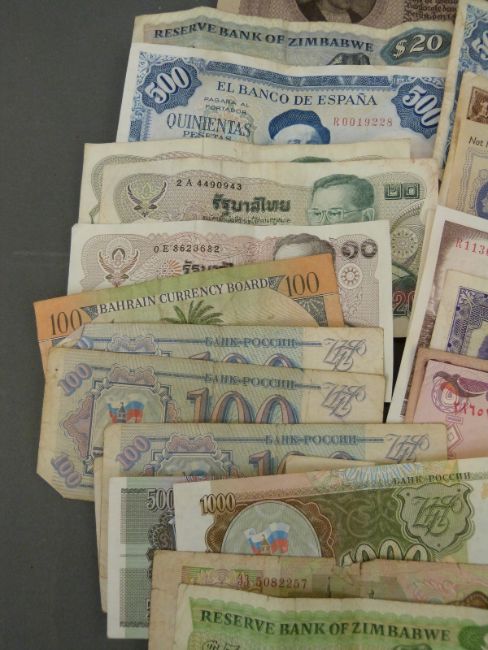A collection of world bank notes in used condition, but some still crisp, includes 100000 mark Reichsbanknote, Russian, Thailand, Oman, Spain, Zimbabwe etc, 29 in all