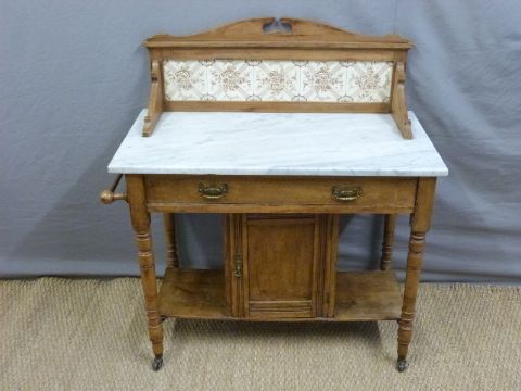 A marble topped satin walnut wash stand with tiled back, W92 x D48 x H110cm