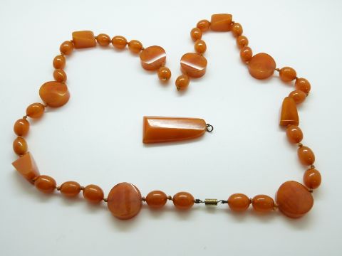 An amber necklace of 40 butterscotch coloured beads of varying shapes, largest approximately 22x9mm, with a large angular pendant 45x20mm, 69g, 73cm long.