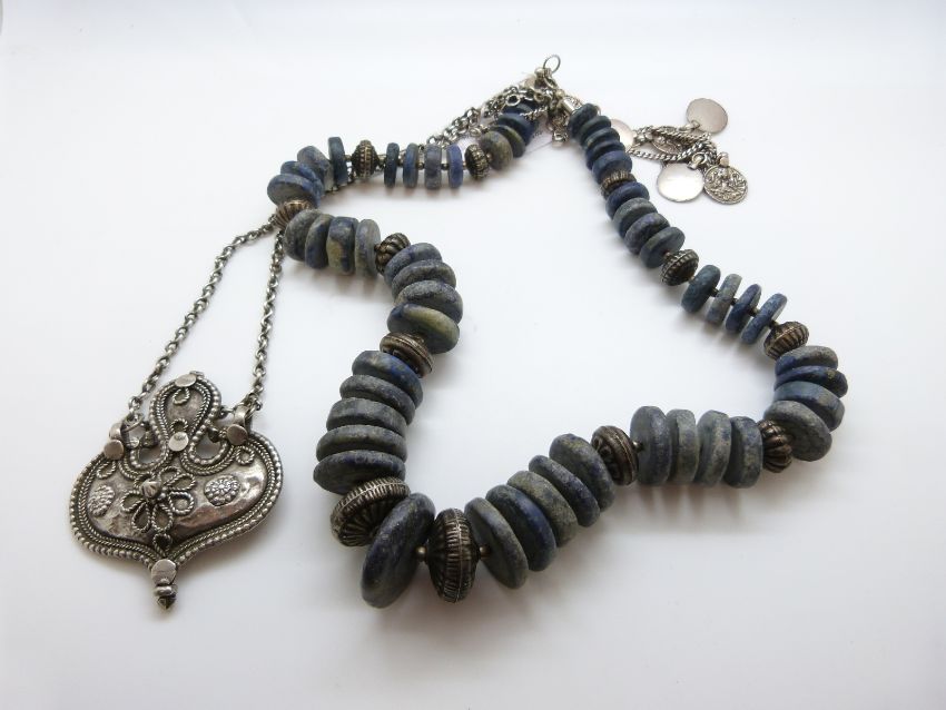 Two Indian white metal necklaces and a lapis lazuli necklace