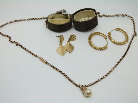 A 9ct gold necklace with a pearl pendant, two pairs of 9ct gold earnings (7.1g), and a silver and gold ring set with a paste stone