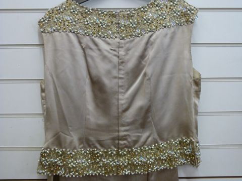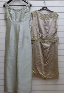 A silk dupion evening dress, the bodice hand stitched with clusters of pearls and sequins, together with a full length evening skirt and top decorated with a border to neck, edge and bottom consisting of pearls, beads etc