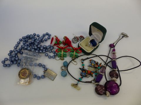 A quantity of costume jewellery, silver necklace, beads, agate beaded necklace, silver charm bracelet with enamel shields etc