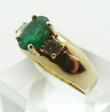 A 14ct gold ring set with an oval emerald and two diamonds, size M, 6.14g