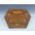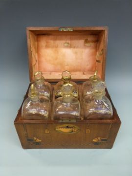 A Georgian mahogany travelling case of six gilt apothecary or similar bottles, each 20cm tall, the outside having shell and other inlaid decoration, width 29, depth 20, height 23.5cm; with remains of label possibly reading Willis's Rooms, King Street, St James's Square, London