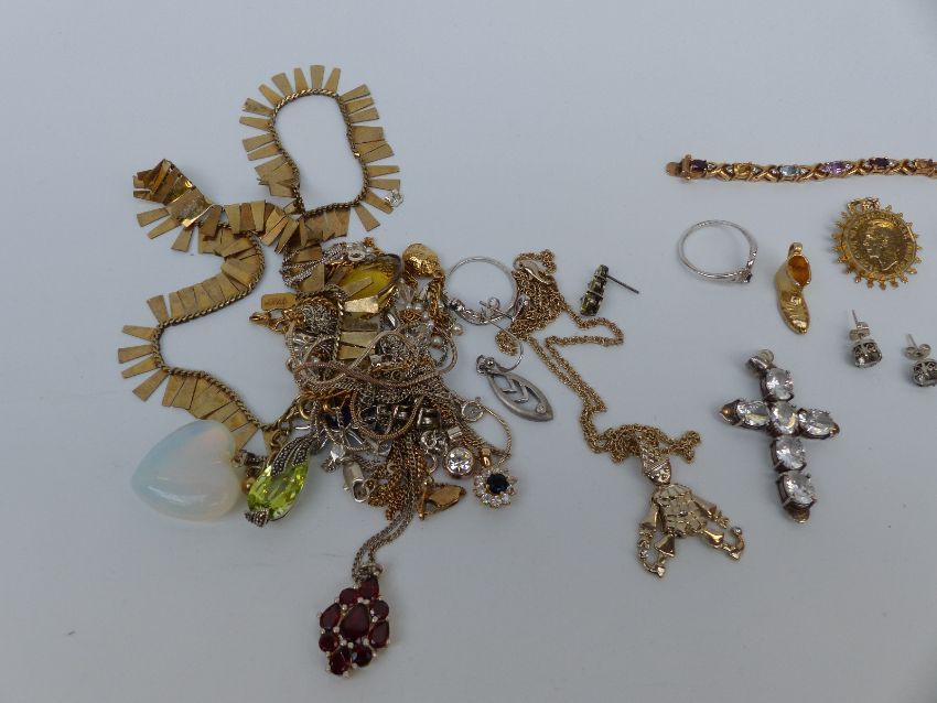 A collection of silver jewellery to include tiger's eye earrings and pendant, two silver rings, garnet pendant, earrings etc