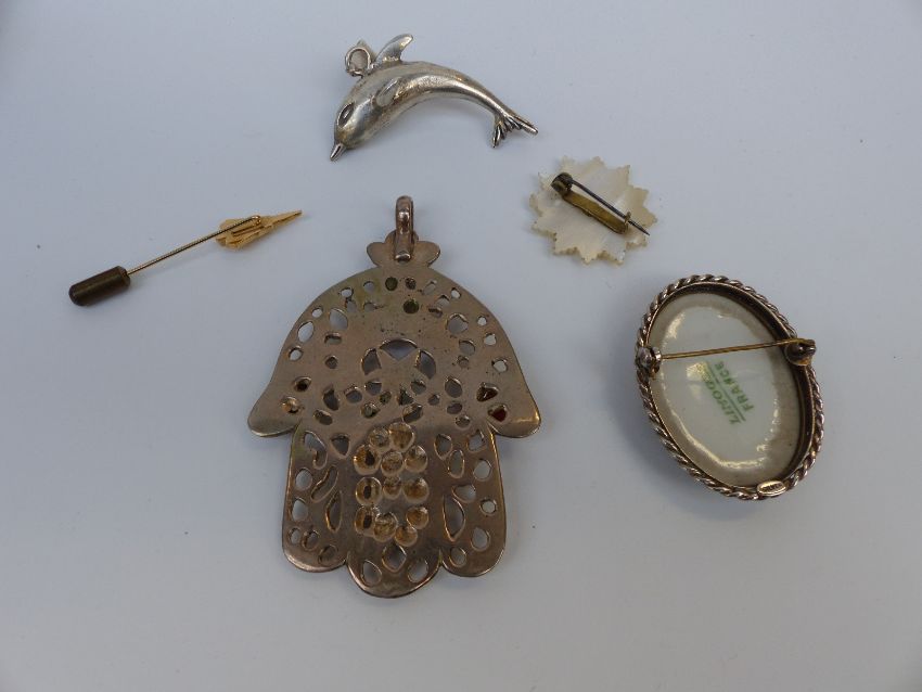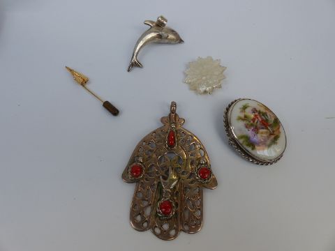 Silver and white metal jewellery, thimbles, Trefari costume, silver dolphin marked Alpaca, mother of pearl necklace, Smiths watch etc