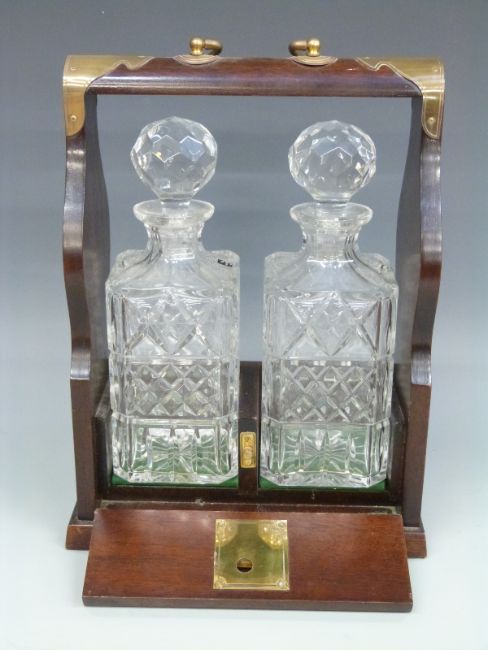 A two bottle tantalus with Edinburgh Crystal decanters, height 35cm